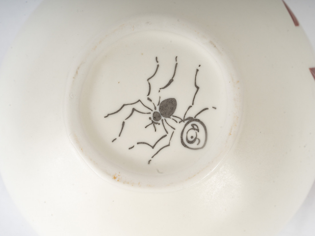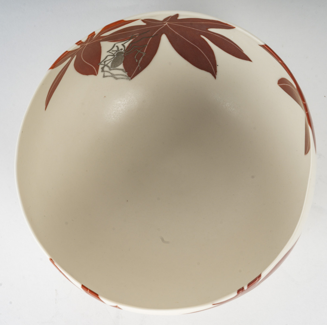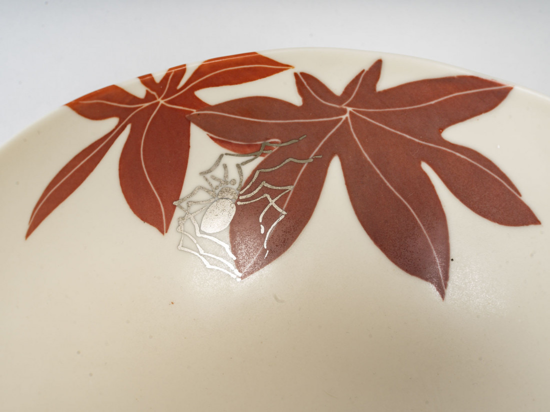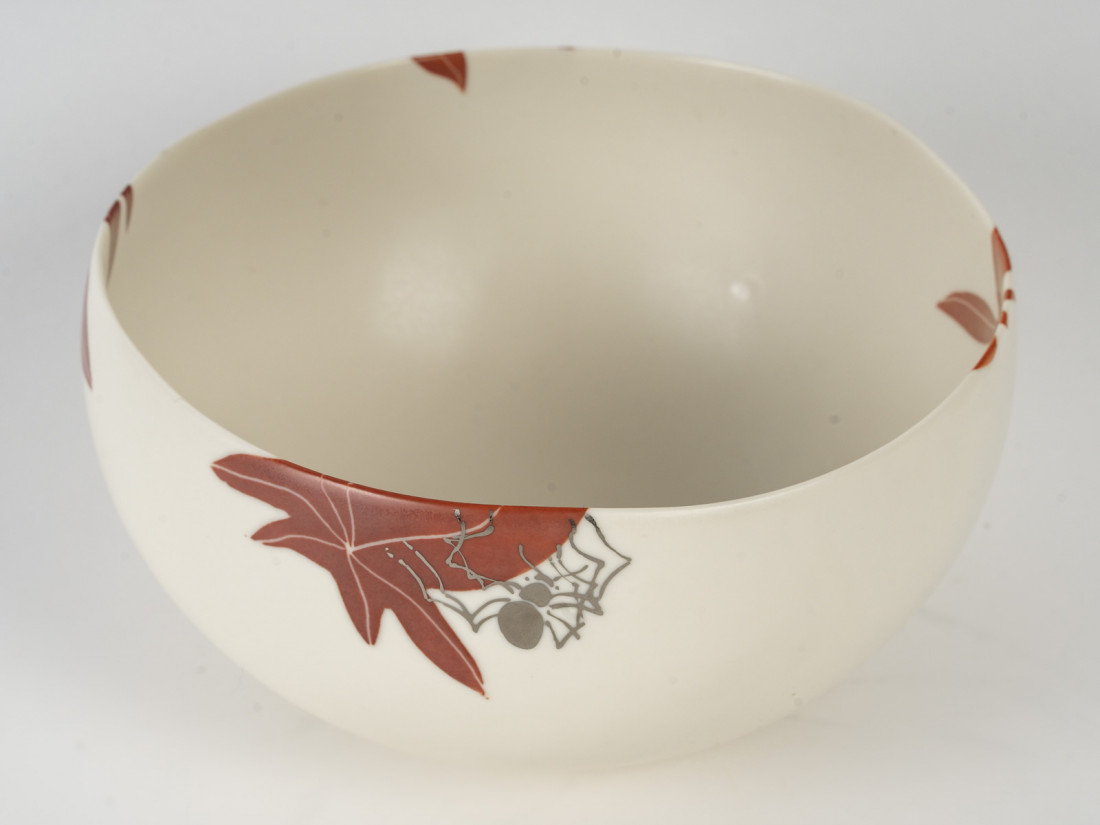 Porcelain bowl decorated with maple leaves and a spider, unique piece, signed Simone Perrotte.
