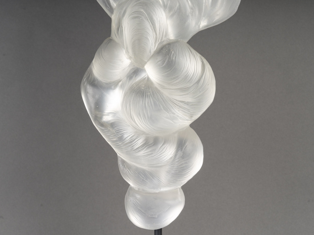 The material then takes on the appearance of a piece of sky, at once transparent and infinite, opaque and muted, luminous and evanescent, with which the artist molds large pieces in the shape of clouds, astonishing in their sensual roundness and delicate lightness, but it can also take on the appearance of spilled water, powerful and vital, trapped in a frozen moment.