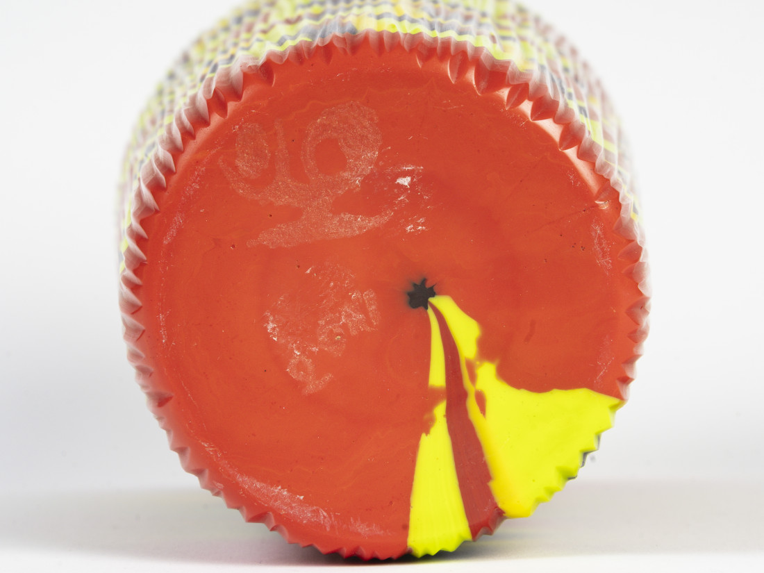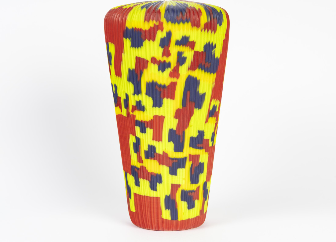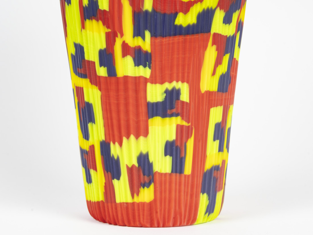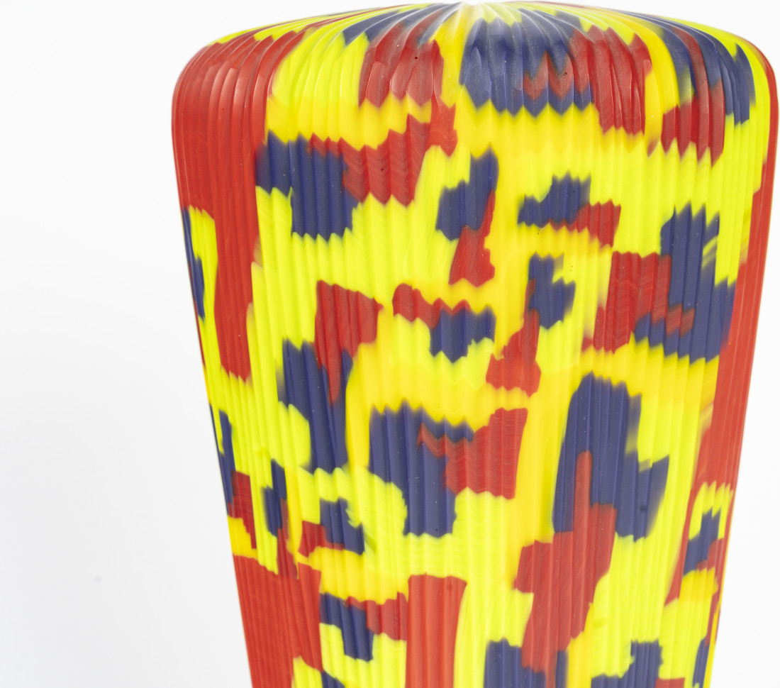Cut blown glass vase from the "Harlequin" series, murrine pattern in several colours, unique piece, dated 2011 and signed.