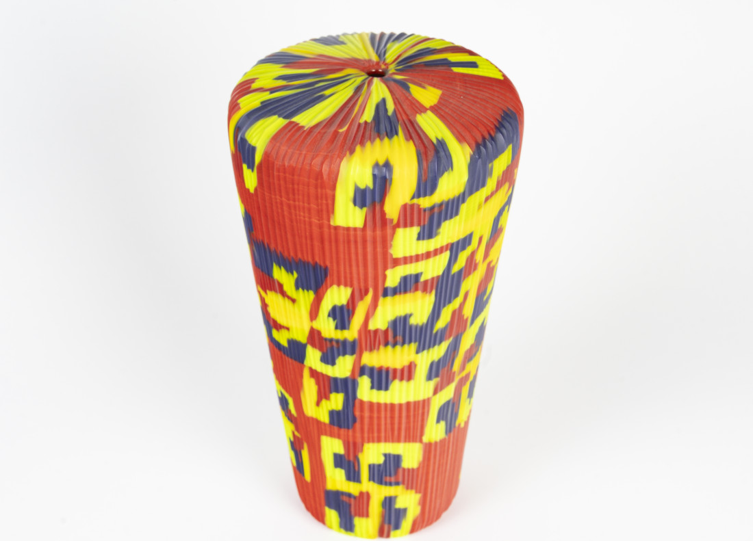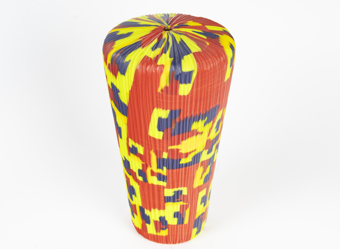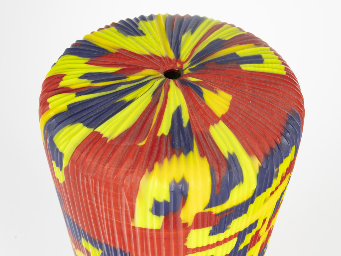 After blowing, the pieces reveal an intricate geometric patchwork, highlighted by subtly arranged colors and an extremely tactile material. Fine and precise carving on the surface of the pieces occasionally adds rhythm to the composition, giving relief and substance to the material.